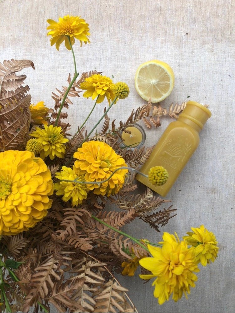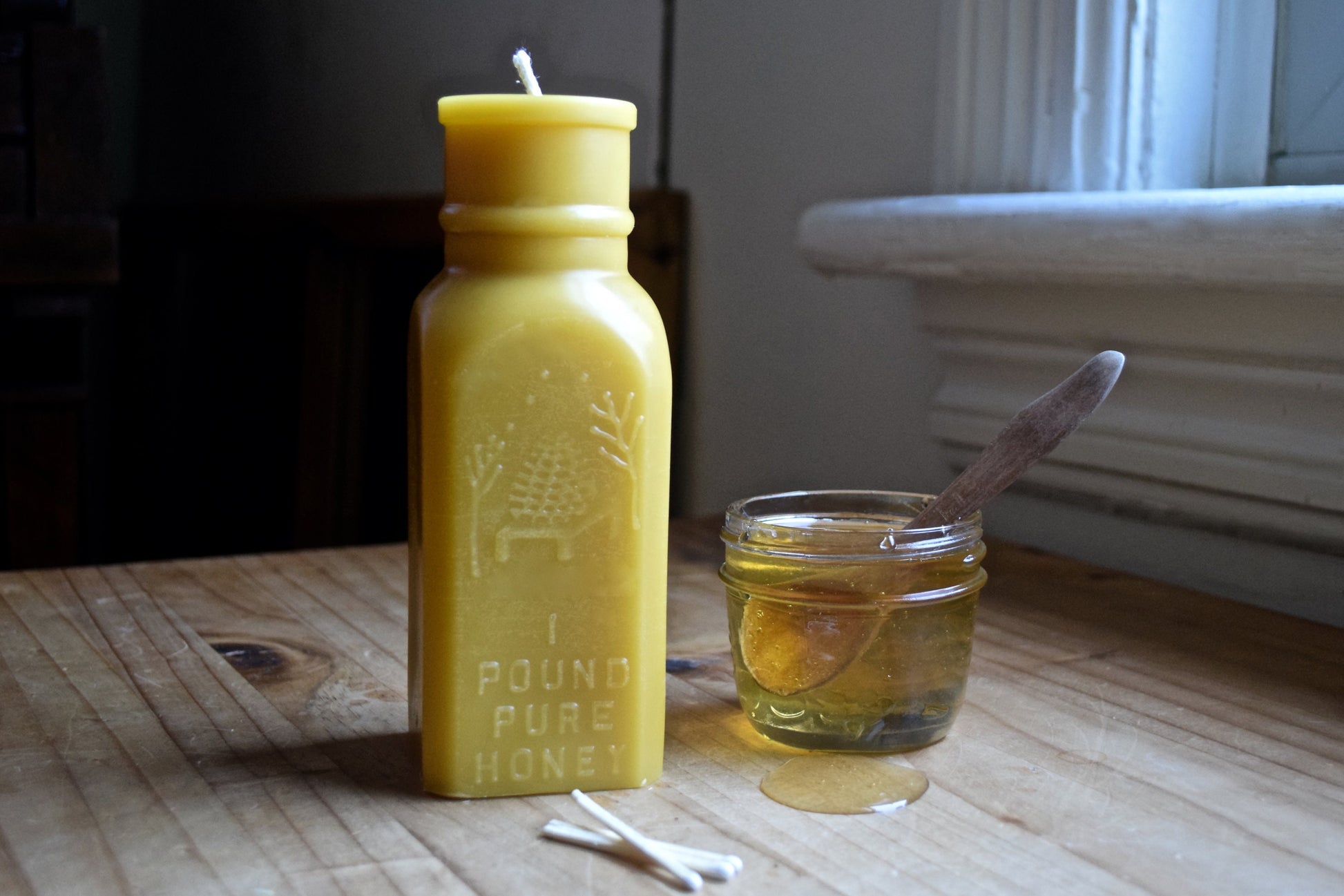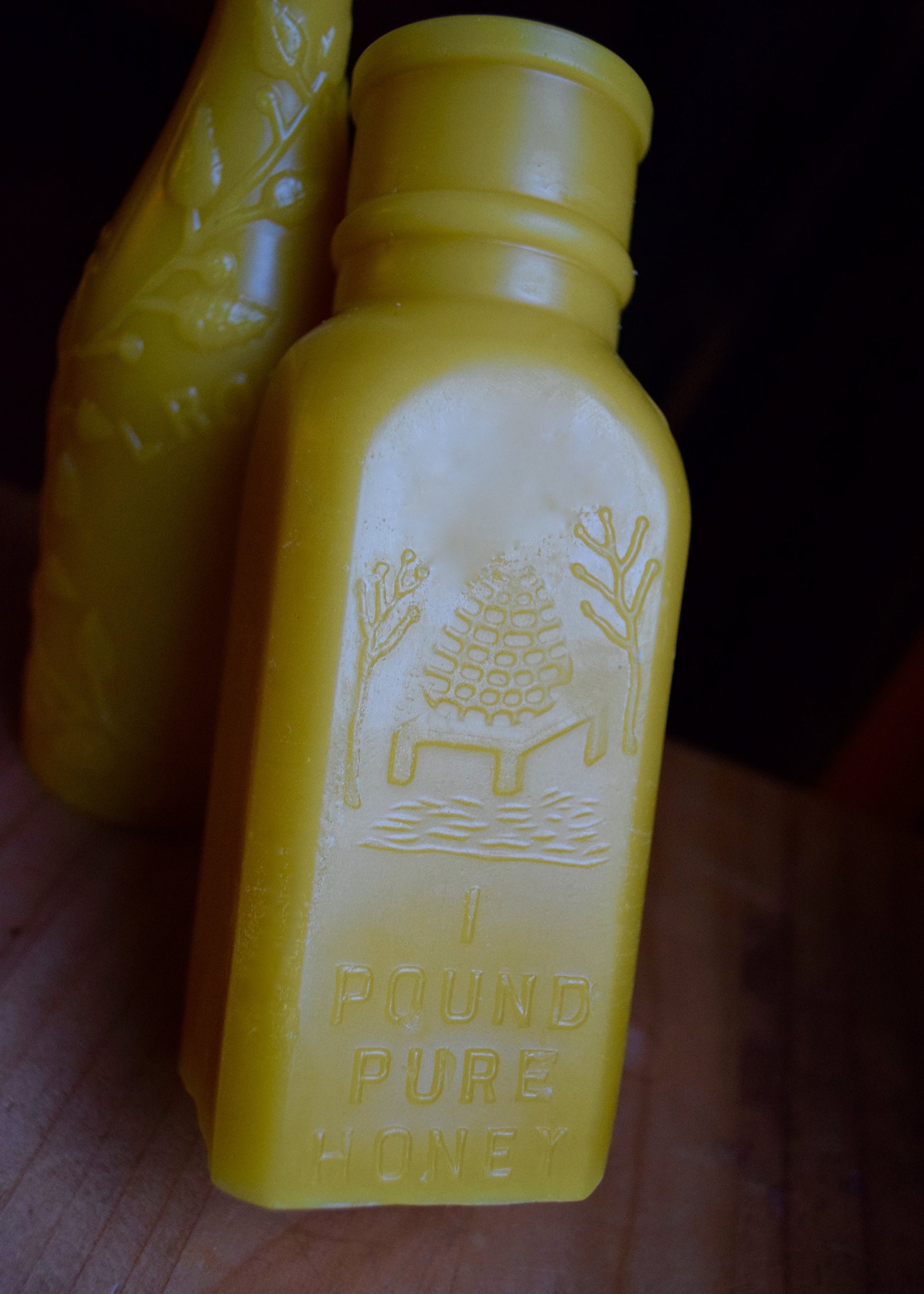 Antique bottles were works of art (nevermind what they contained). The old honey glass bottle this candle was molded from is just beautiful, with an embossed, textured hive of bees.