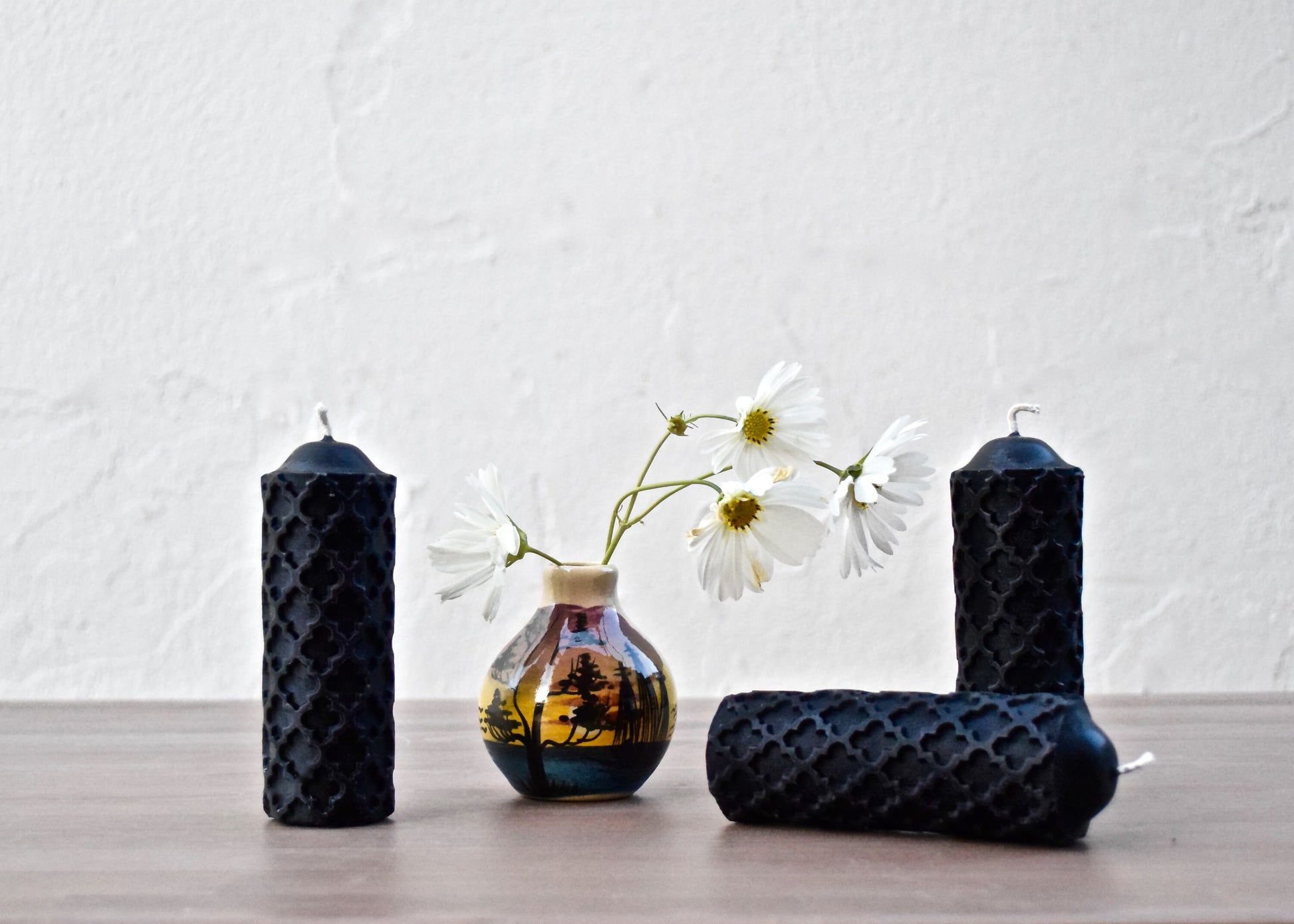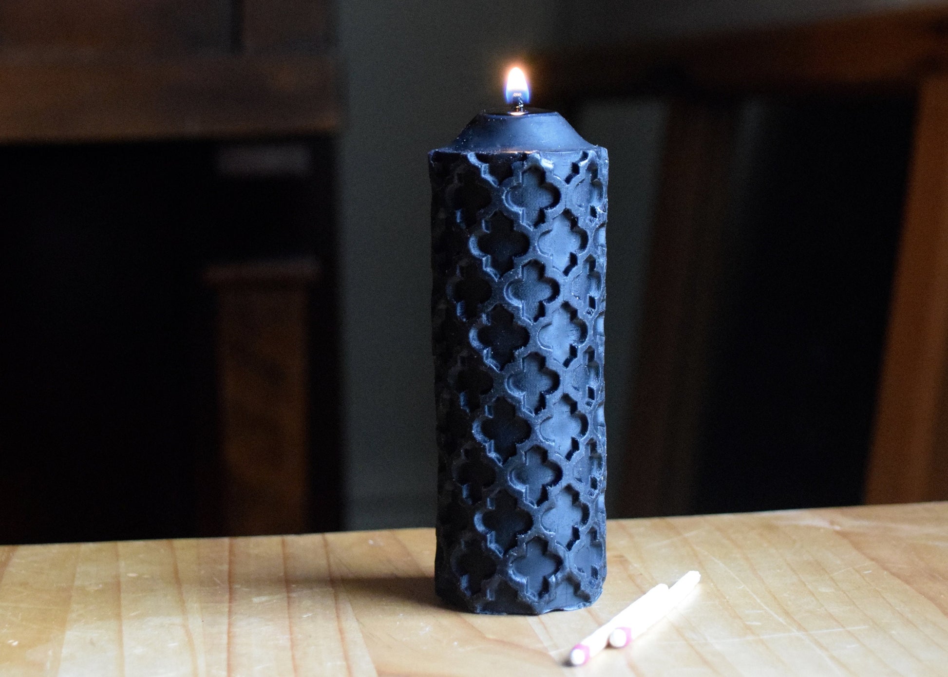 Here's a special version of my popular Medieval Window pillar - in pure 100% beeswax colored with eco-friendly, vegetabe-based dyes. Handcrafted from local sustainable, eco friendly wax I've filtered myself. You will receive one pillar black beeswax candle that is 4.5" tall (8.5cm) just under 1.4" (3.5 cm) & is made with pure cotton square braided wick. Also available in natural yellow (see last photo) and cream. Photo credit: Emma from @BlackandSmith