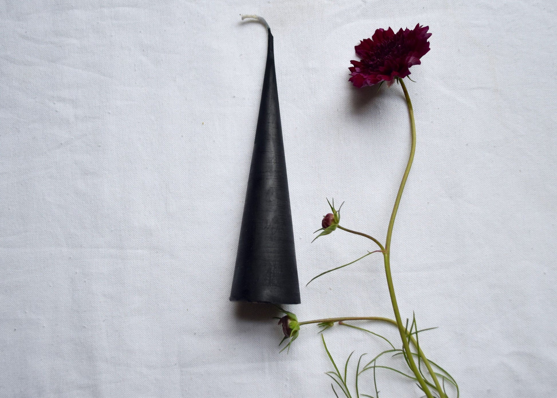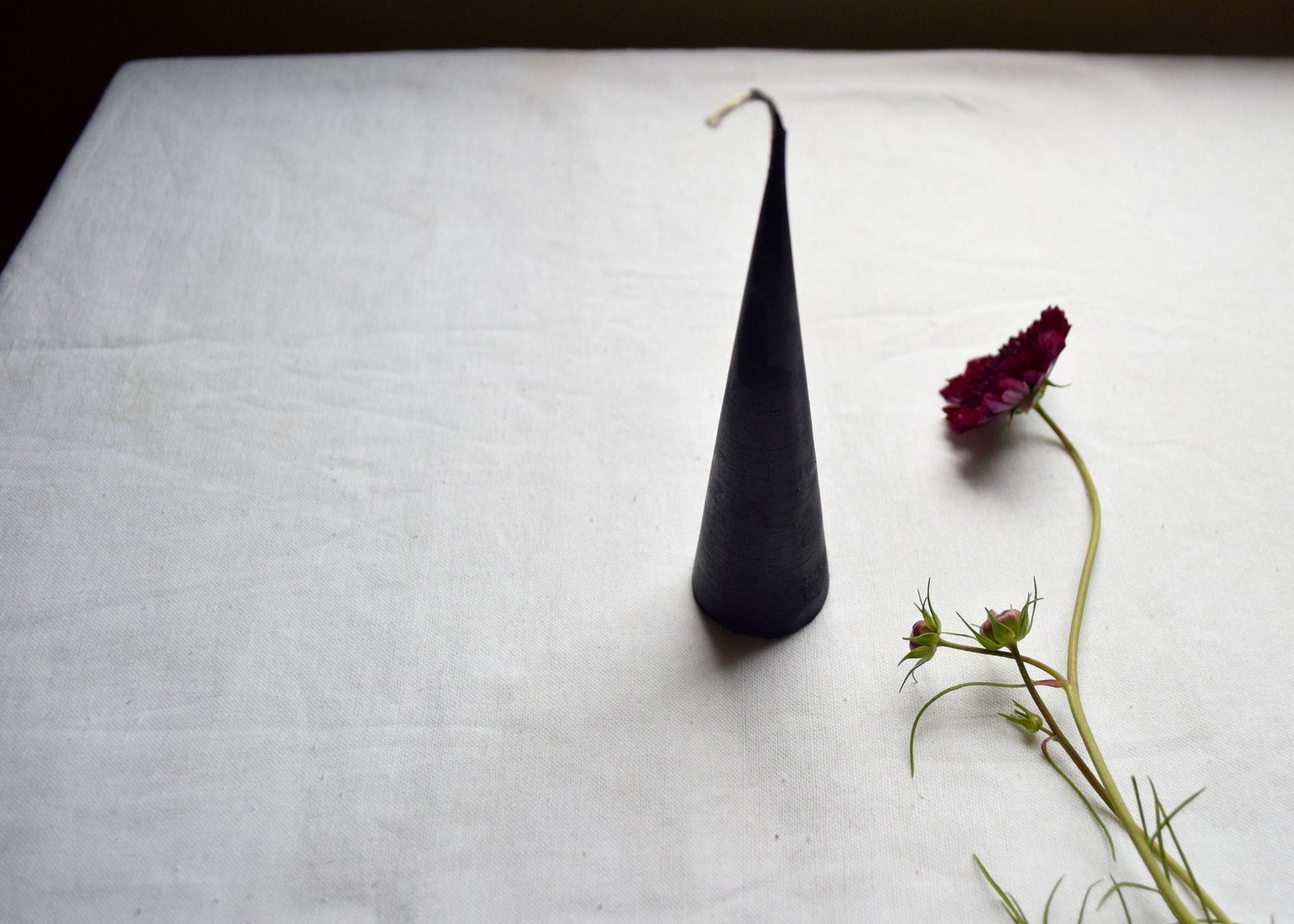 It's a cone-shaped pillar, round and geometric and perfectly smooth. Looks simply beautiful. Handcrafted in 100% beeswax, in black. I use Prop 65-tested, EU compliant, vegetable-based dye.