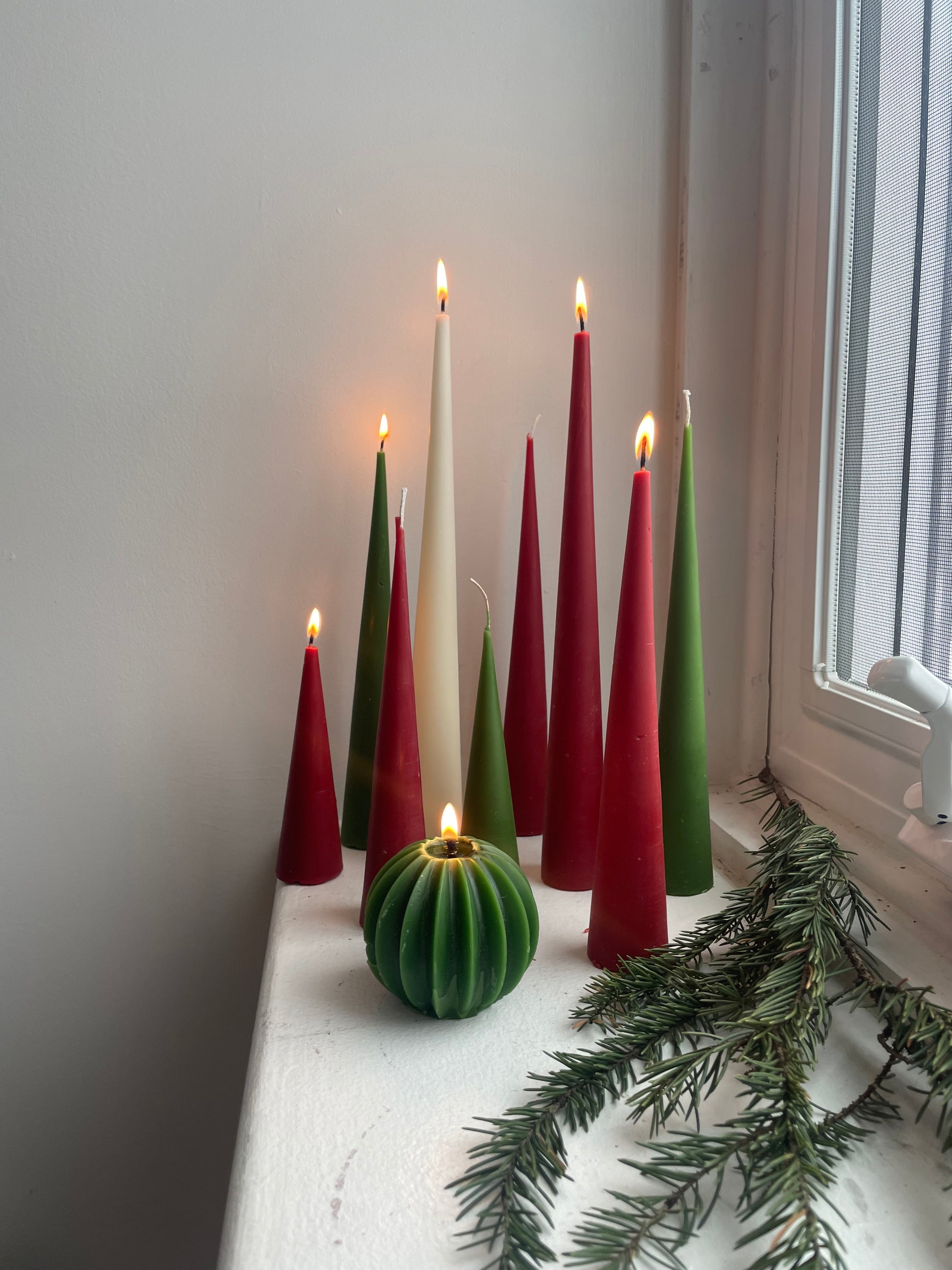 These cone candles are modern versions of taper candles that sit flat on your table, in a tray or any tealight-sized container.