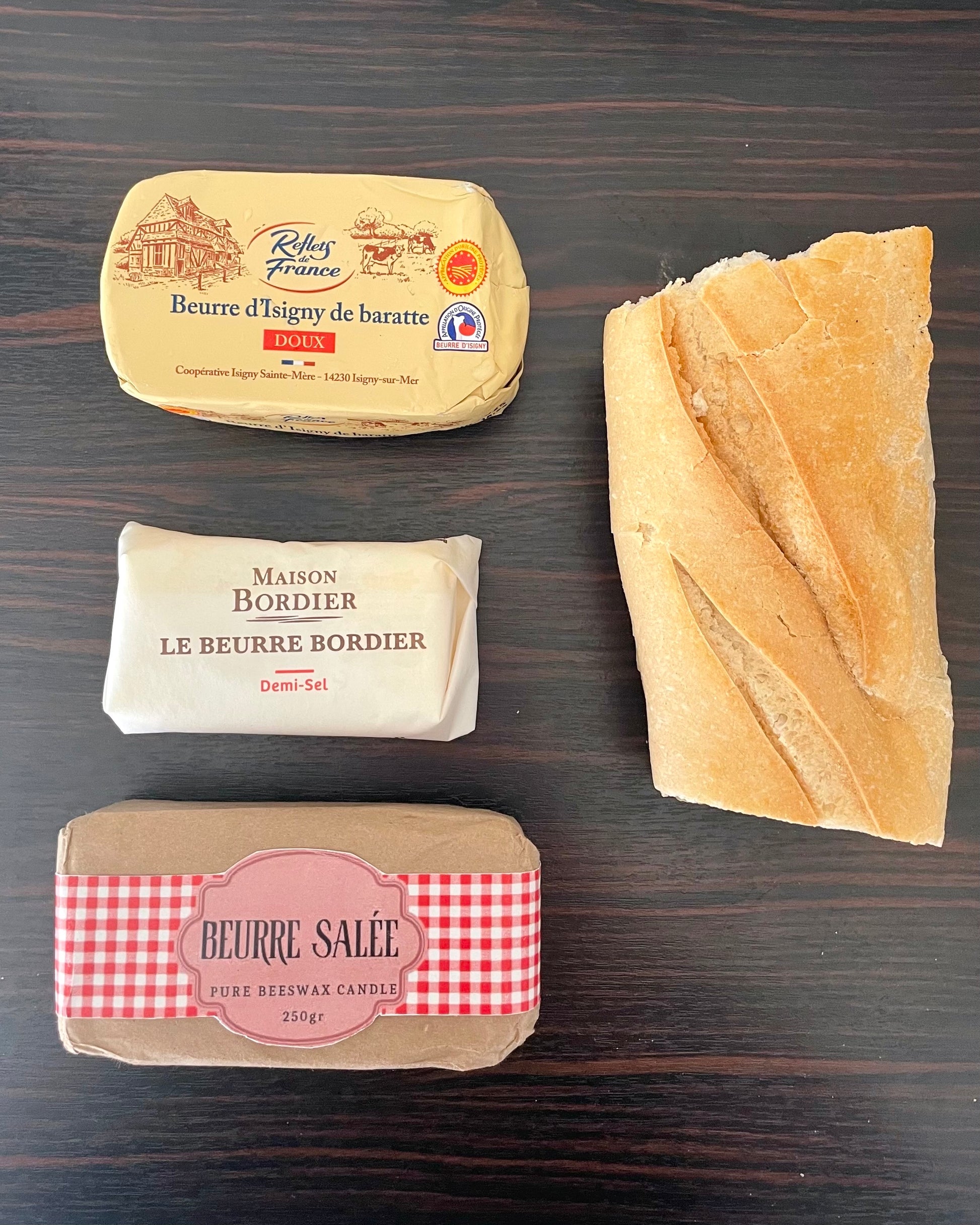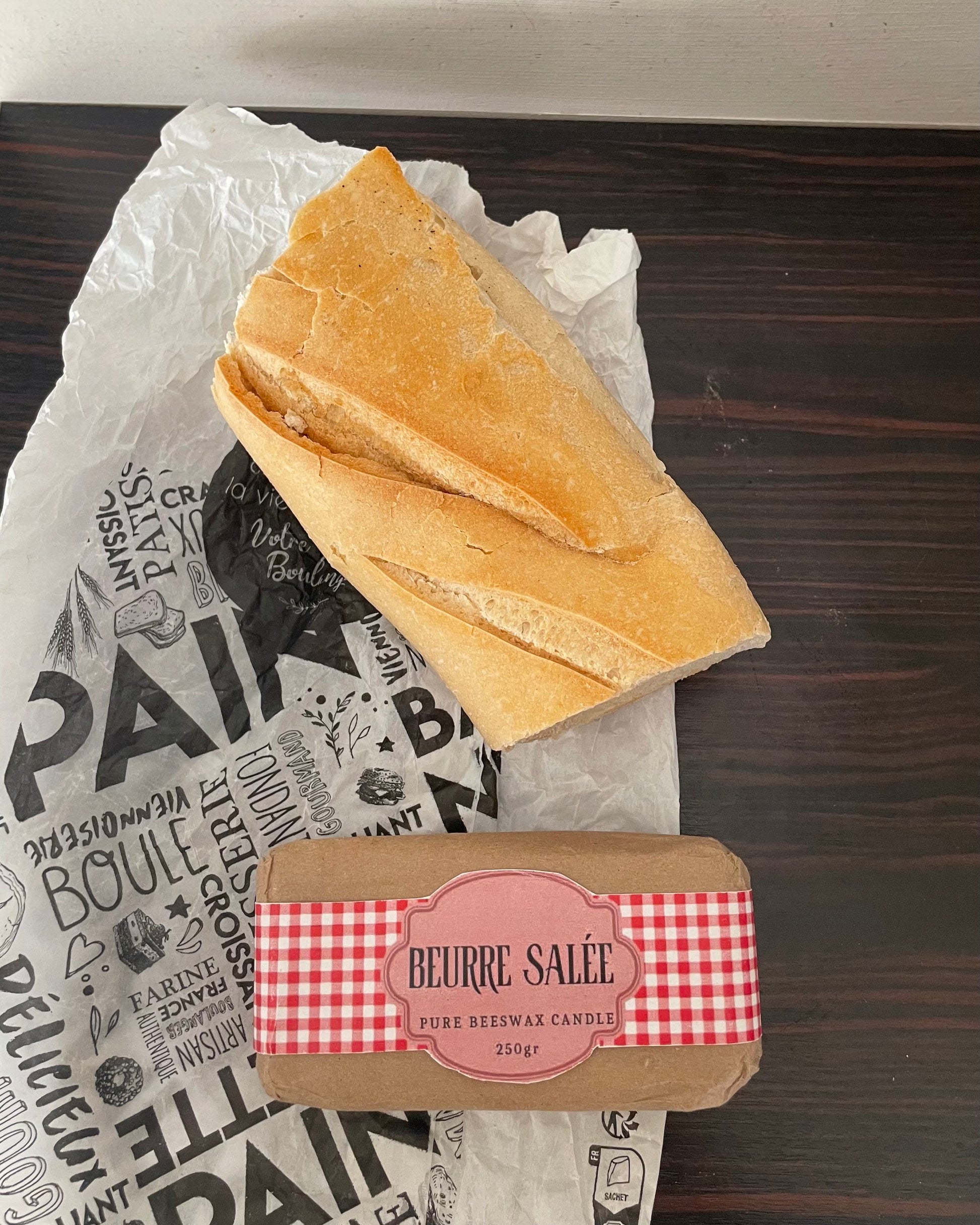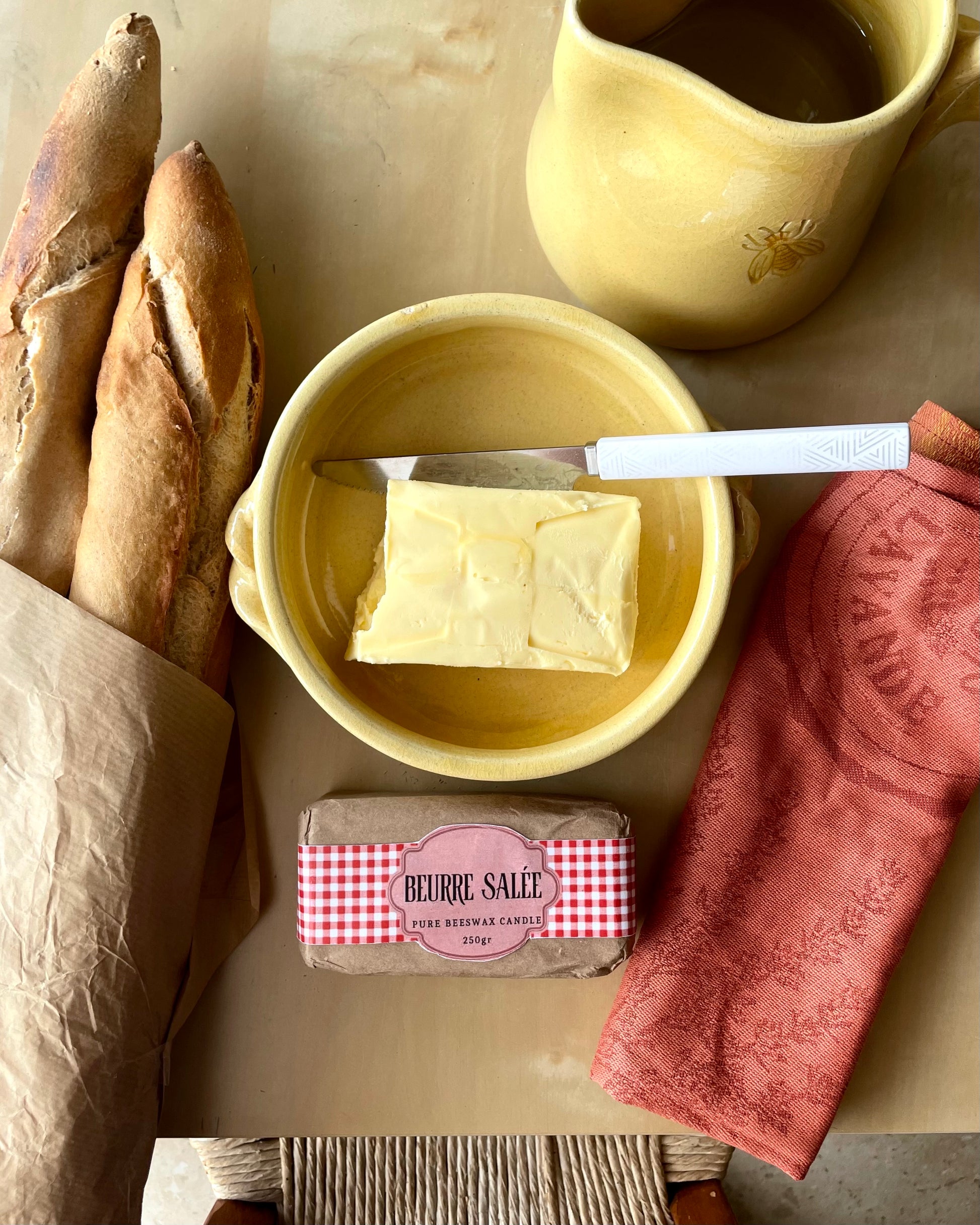 I made this mold from a block of local butter, and each candle has two wicks. It comes wrapped in paper with a pretty label, so it's ready to gift (along with a bread candle perhaps).