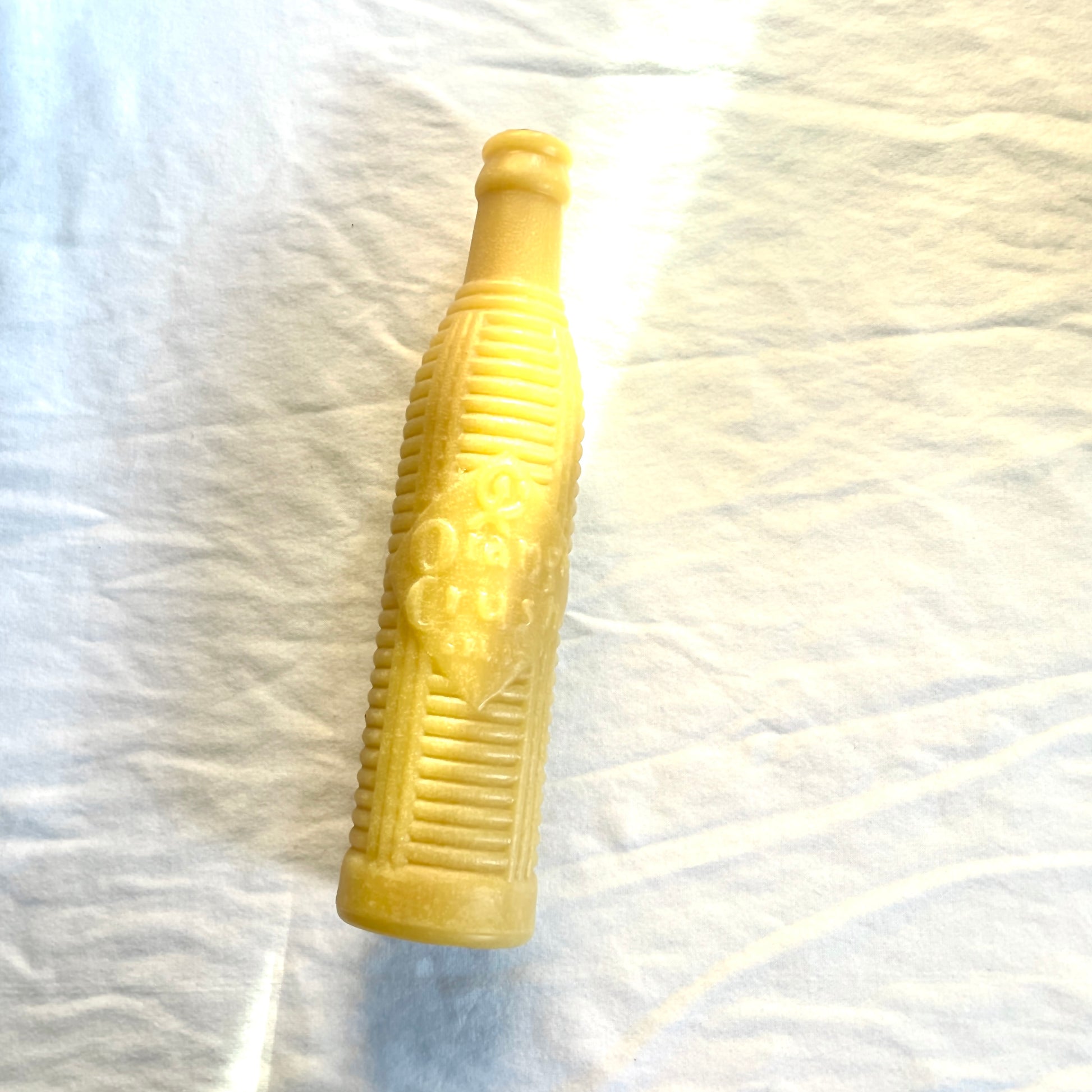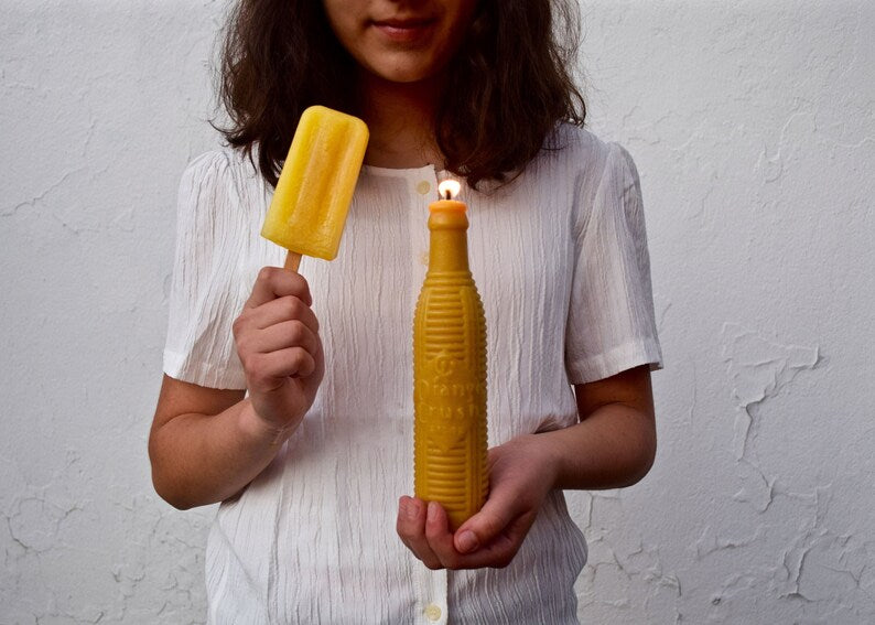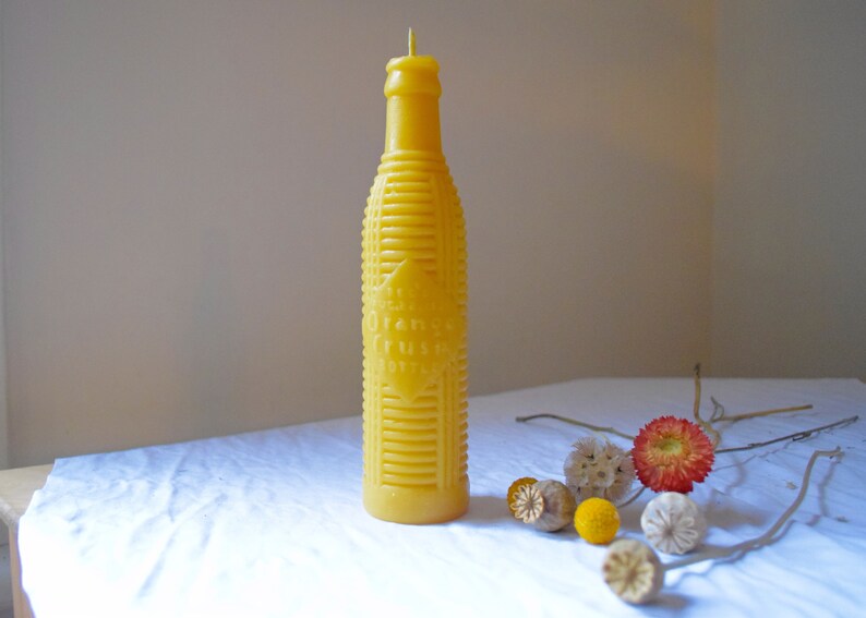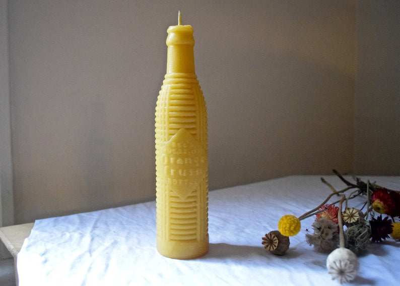 A pure beeswax candle made from a rare Orange Crush pop bottle dated August 22, 1921. That's 103 years ago! This candle is totally unique and the mold is one-of-a-kind which makes it extra special.