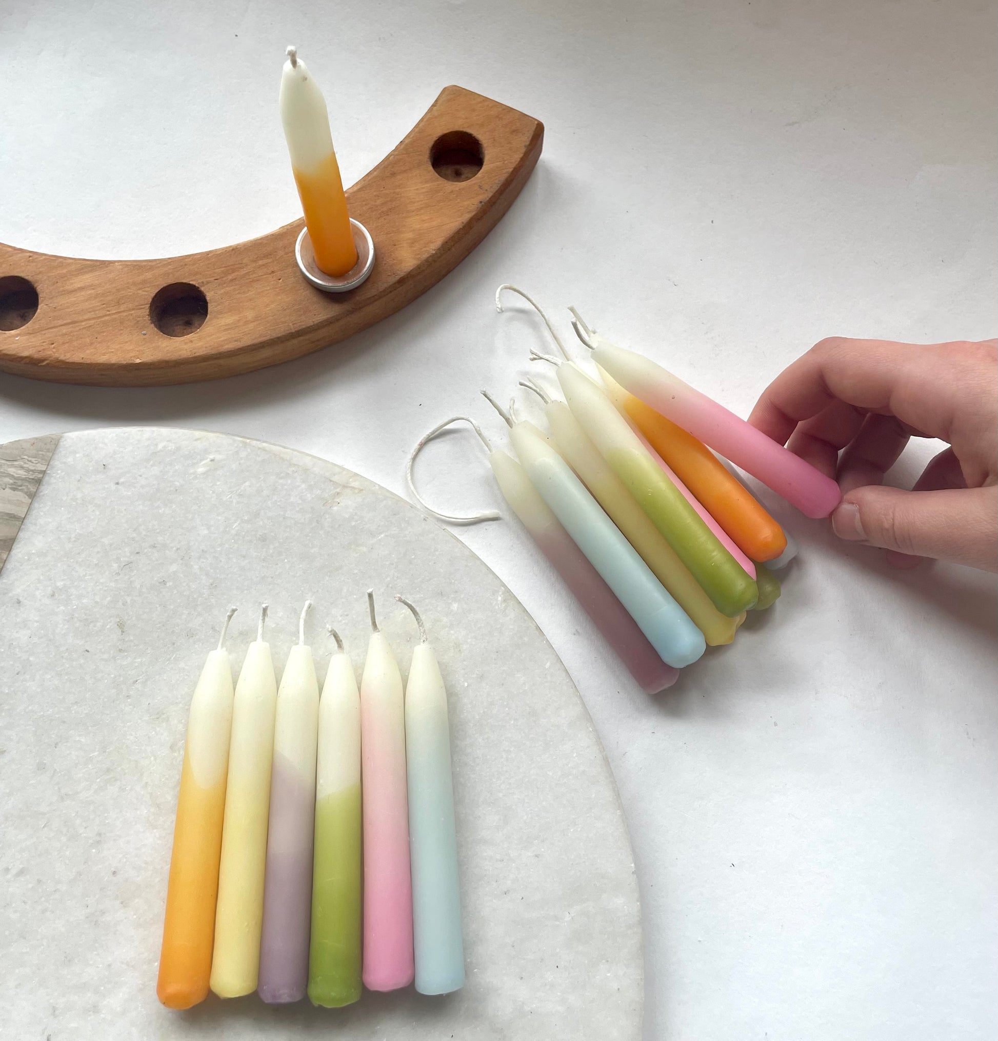 A set of (6) dip dye pastel candles for cakes & birthday rings. Made by hand with 100% beeswax. Approx 10 cm high, 12 mm wide.
