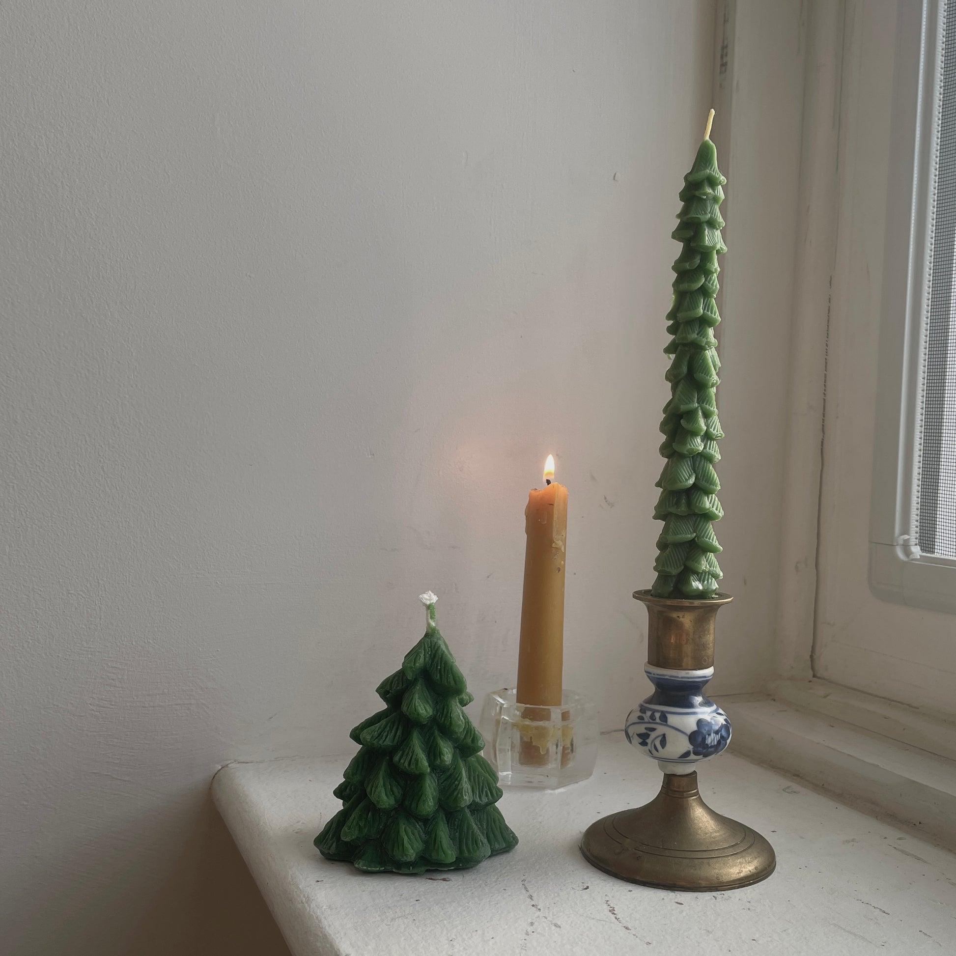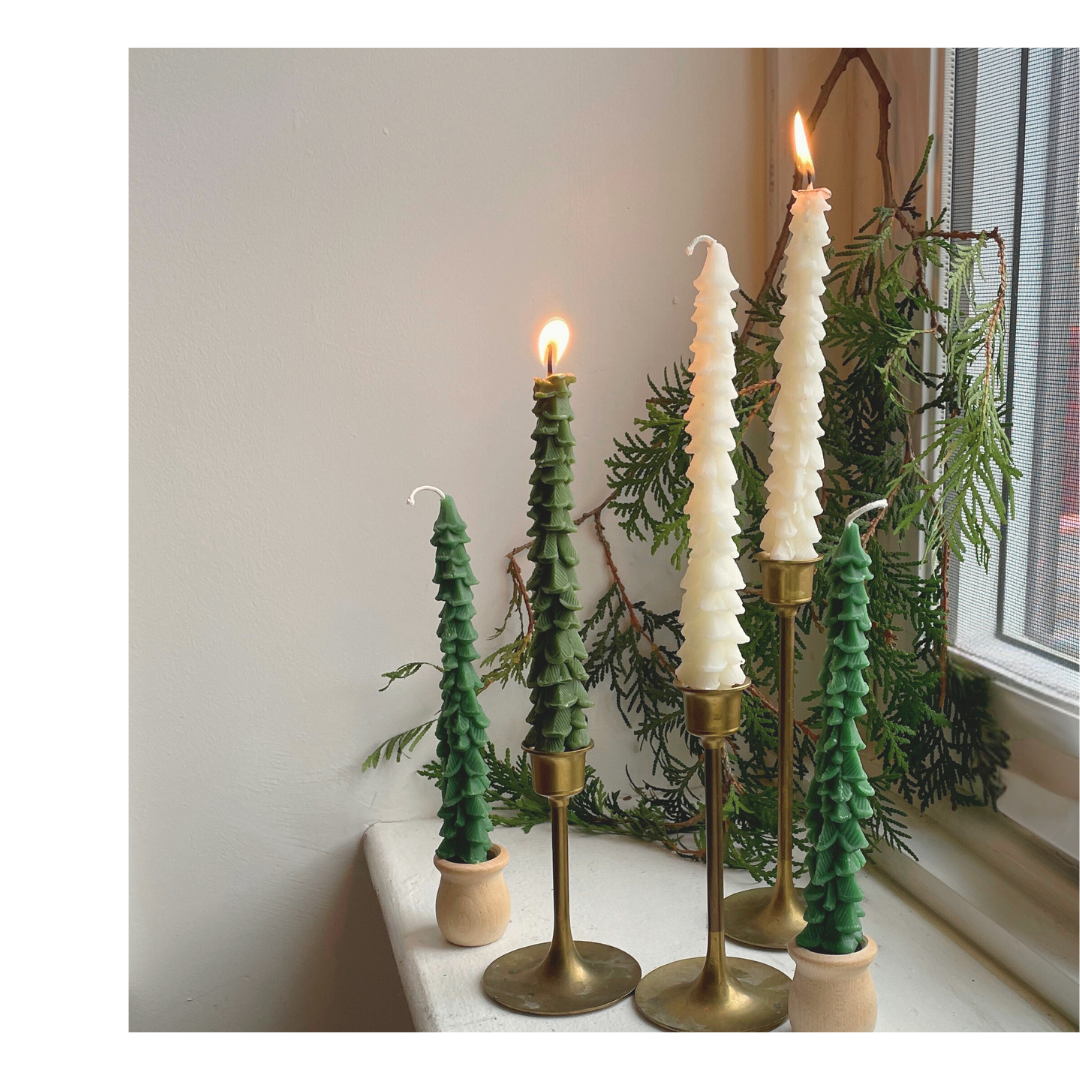 The beauty of an evergreen tree candle... but make it a taper. In green or snowy off-white beeswax.