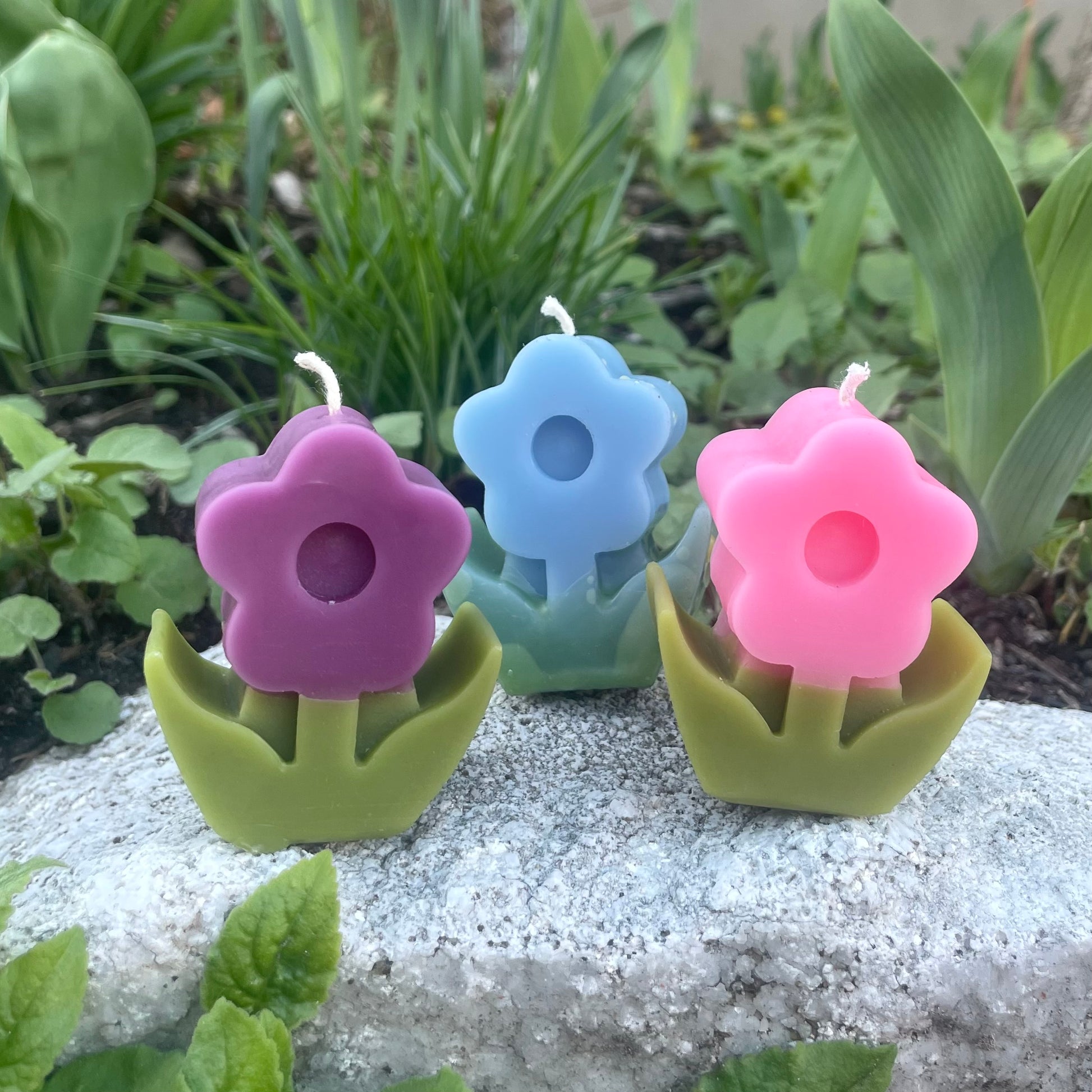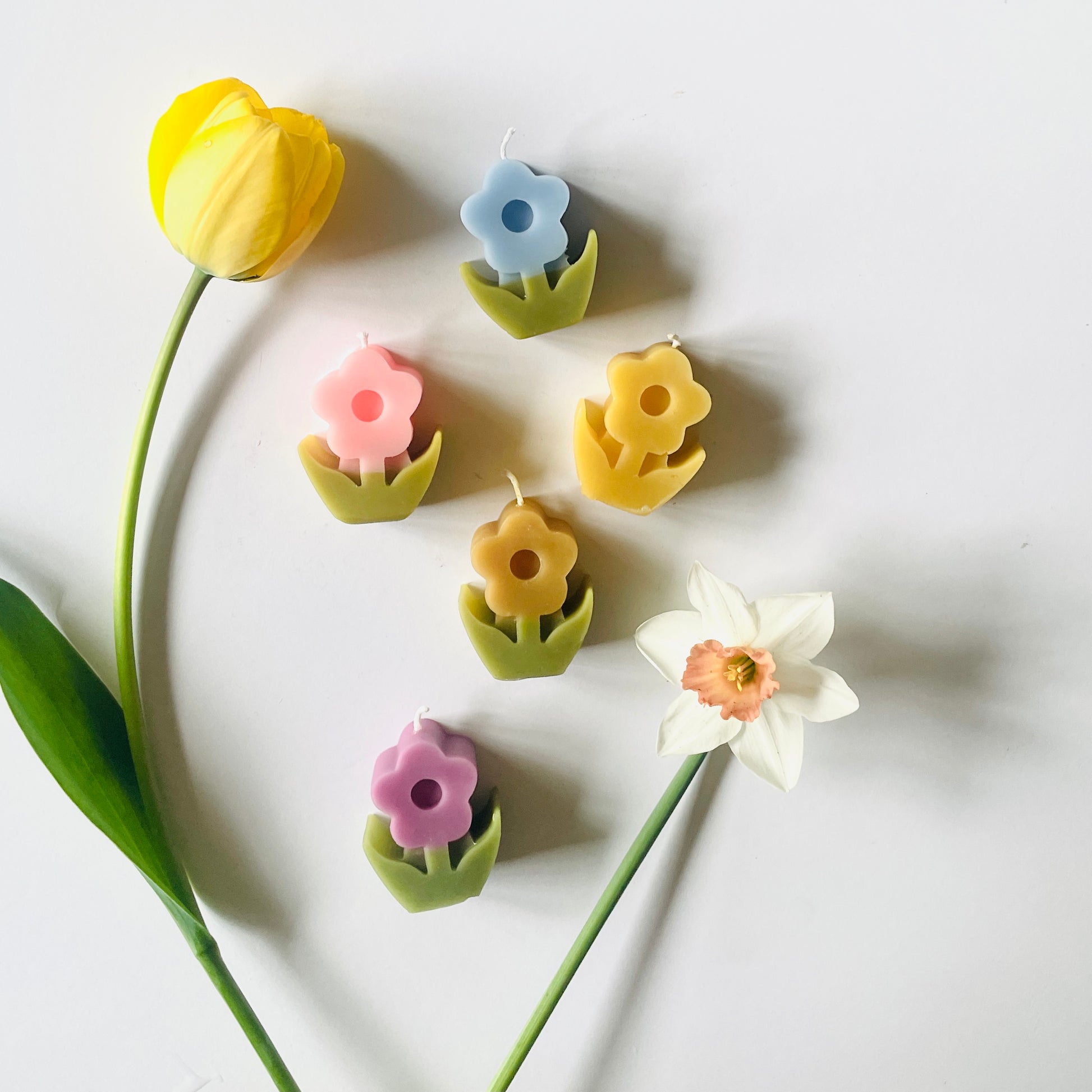 NEW! Pretty, sculptural flower candles in pure 100% beeswax. You choose your favorite: blue, pink, yellow or purple blossom with green leaves (or solid yellow).