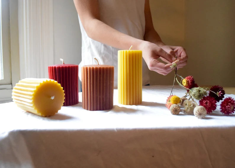 Pure beeswax fluted pillar candles in two sizes, in a trio of colors: burgundy, yellow gold and caramel brown.