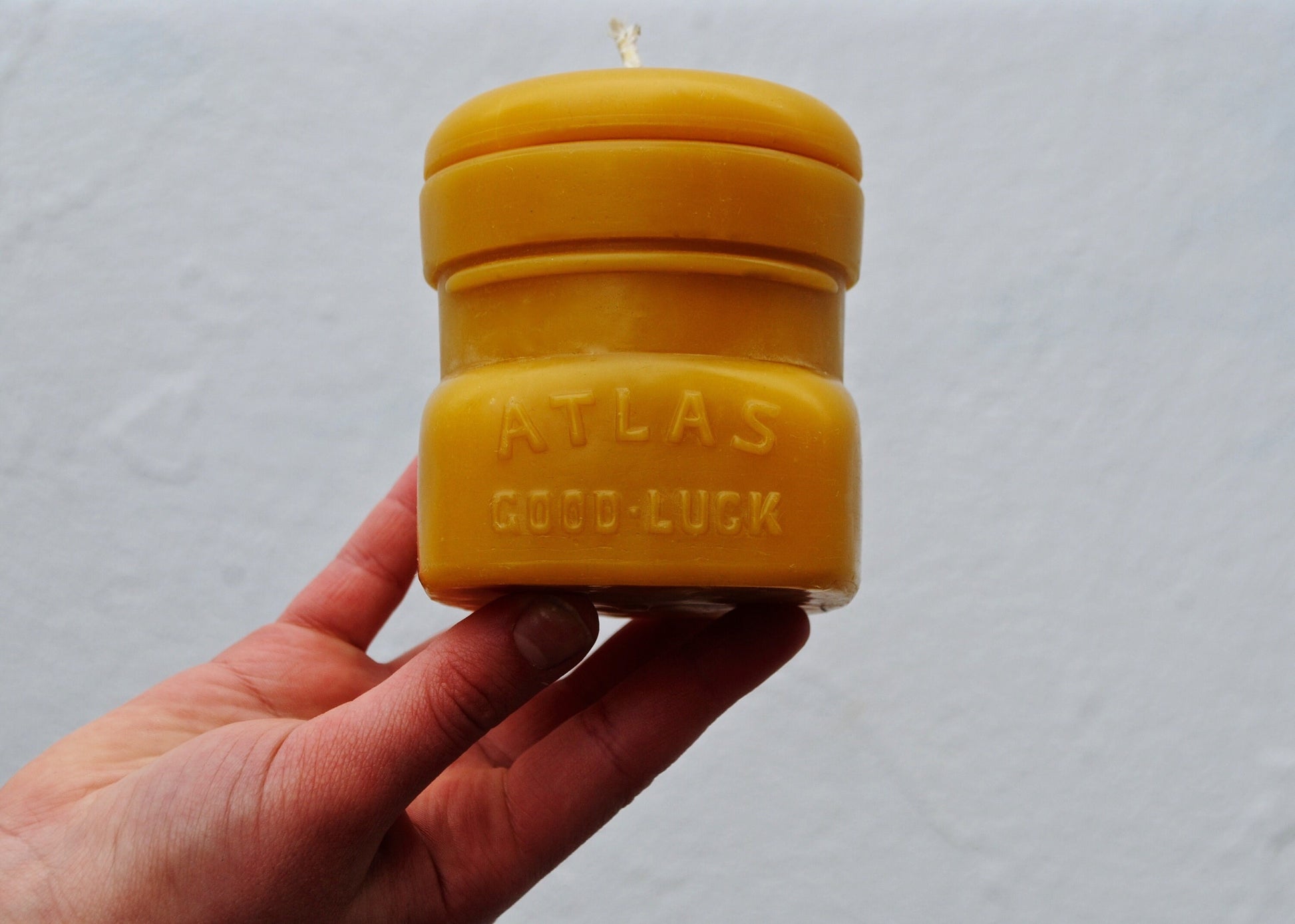 I love this candle. It's made with a mold from a super rare half pint antique canning jar from the 1930s that is full of good fortune. The embossed "good luck" lettering is very clear and makes for a special, one-of-a-kind gift!