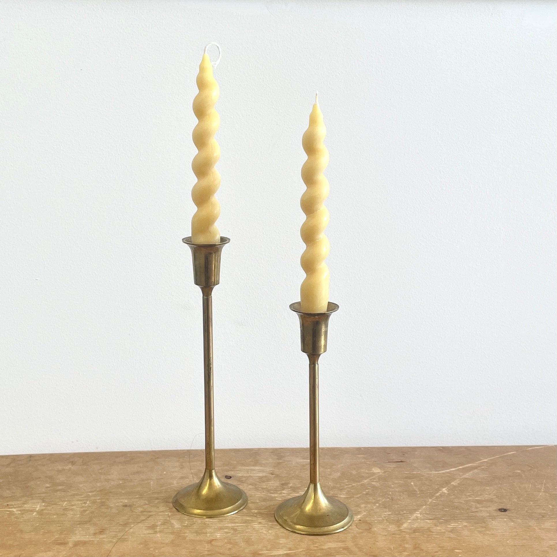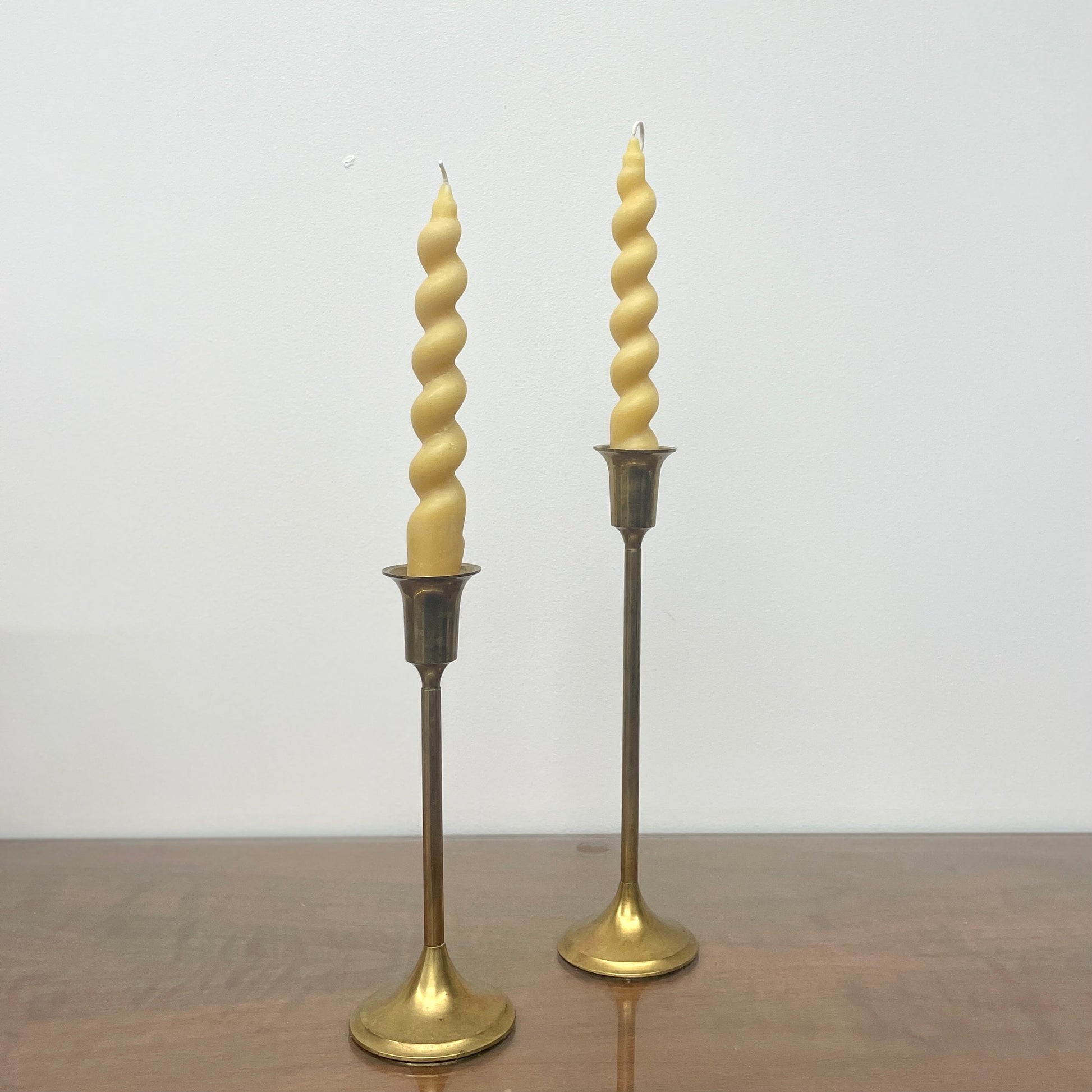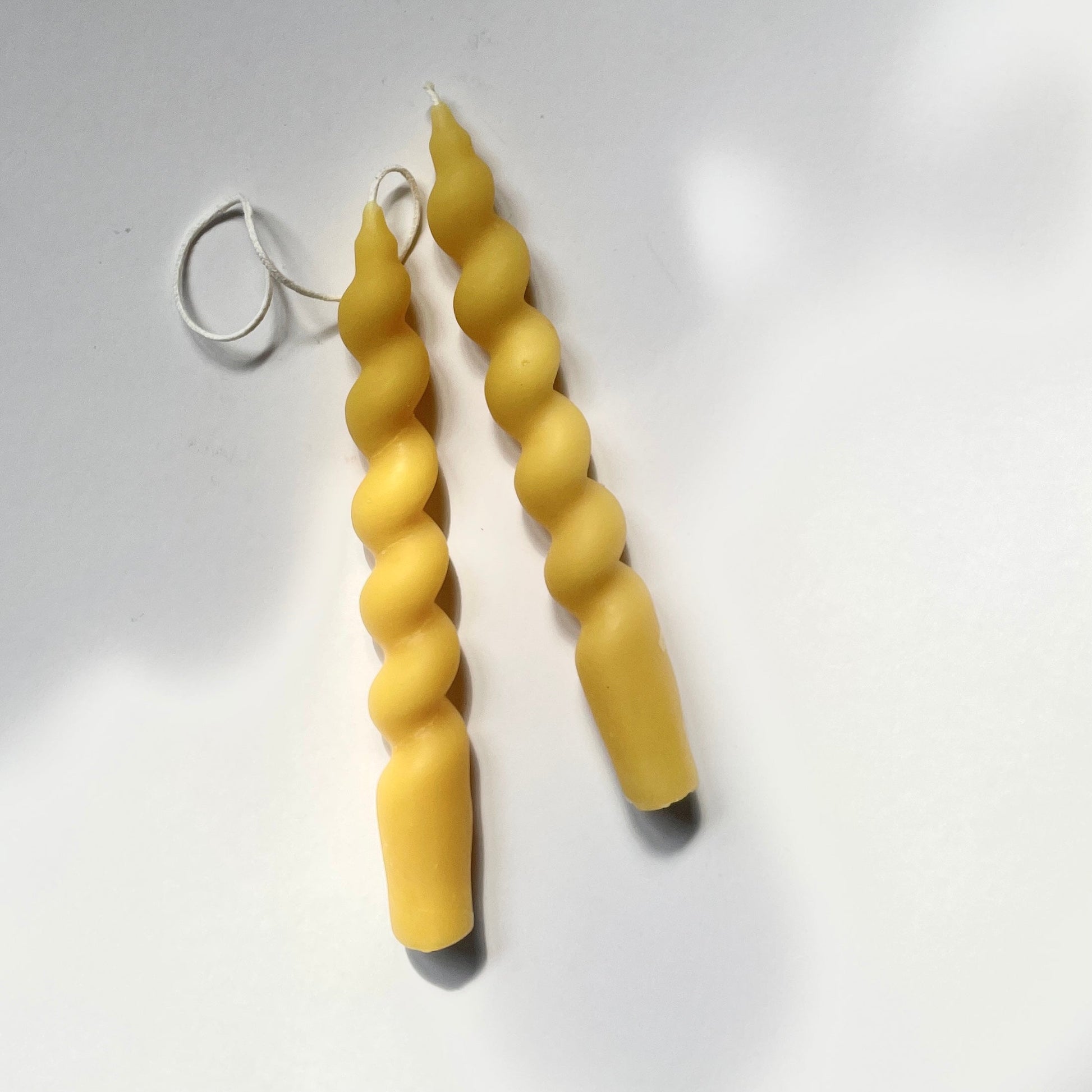 Here's a pair of sculptural, wavy + curvy 8" pure beeswax taper candles.