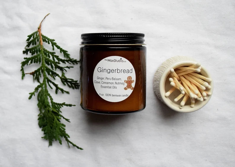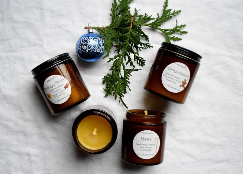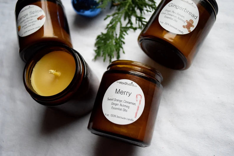 Holiday Beeswax Candle in a Jar - 4 oz. Amber Glass Jar - MERRY, Gingerbread or Orange Spice- Beeswax Candle, Jar Candle, Candle