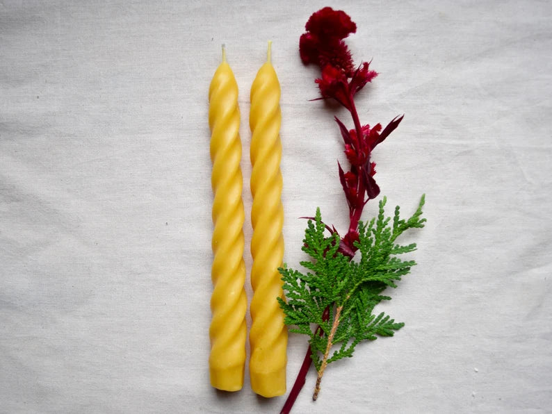 Here's a pair of twisted 8" pure beeswax taper candles. Beeswax is the most luxurious wax in the world - and is the healthiest to breathe and burn, and is eco friendly and sustainable for the earth too.