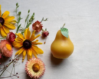 The pear and the lemon are in undyed beeswax, and the orange is colored with Prop-65-tested, eco vegetable-based dye.