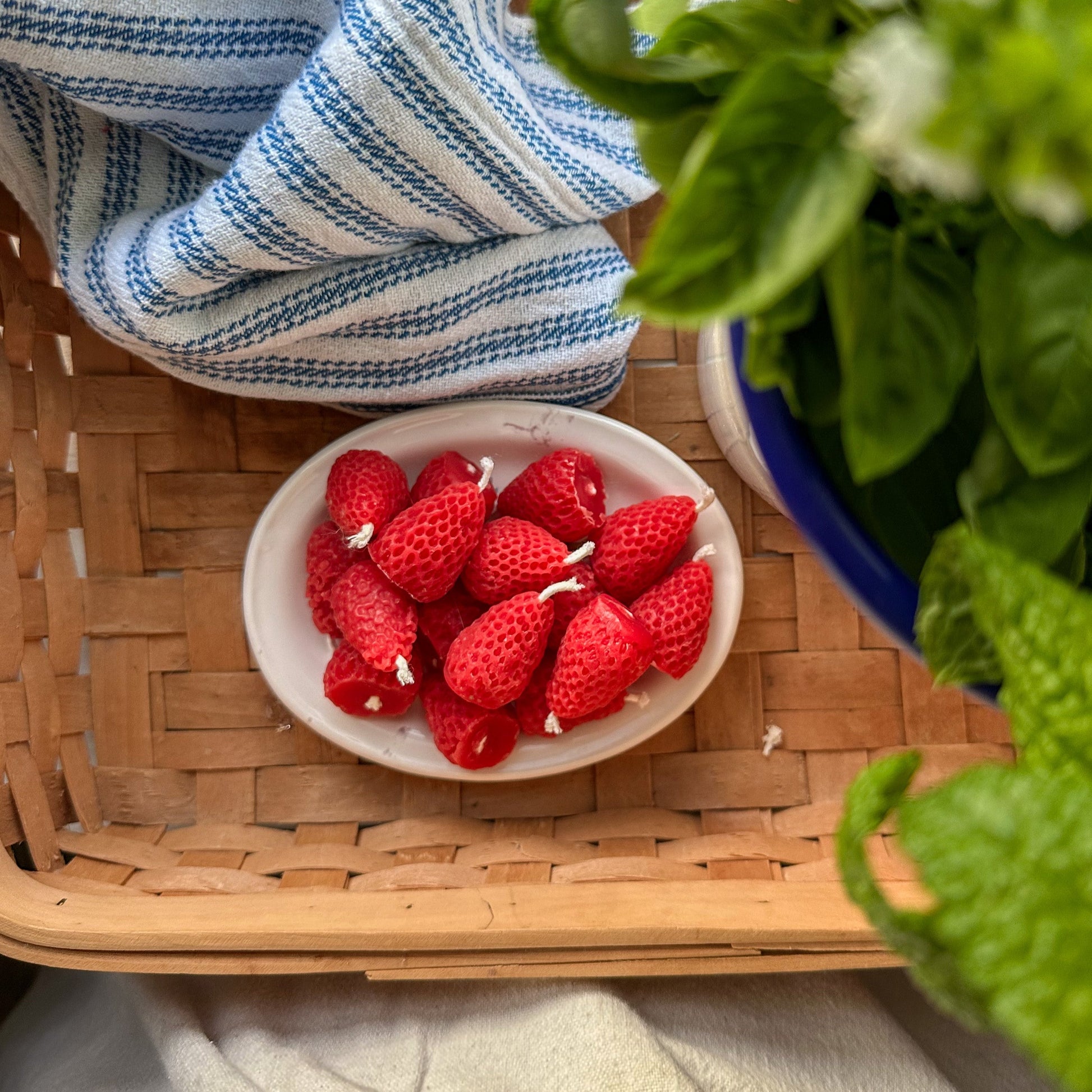 Strawberry season year-round with this set of a dozen mini strawberry candles. I make each one with pure 100% local beeswax and prop-65 tested vegetable based eco dye.
