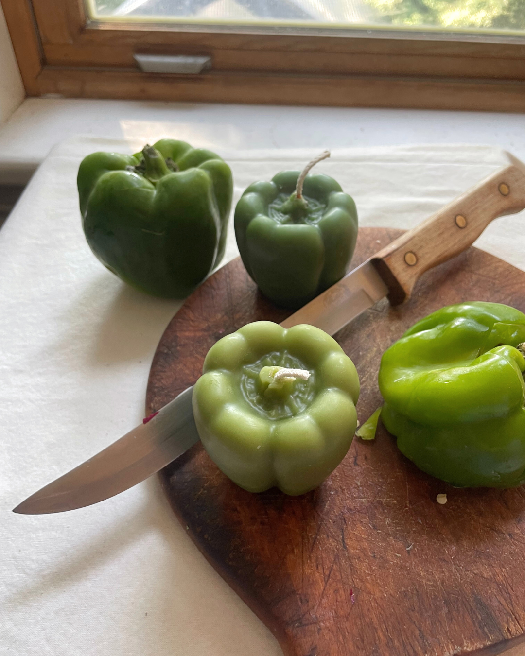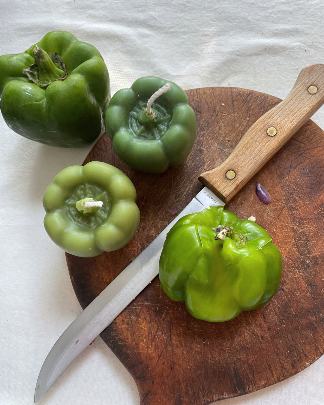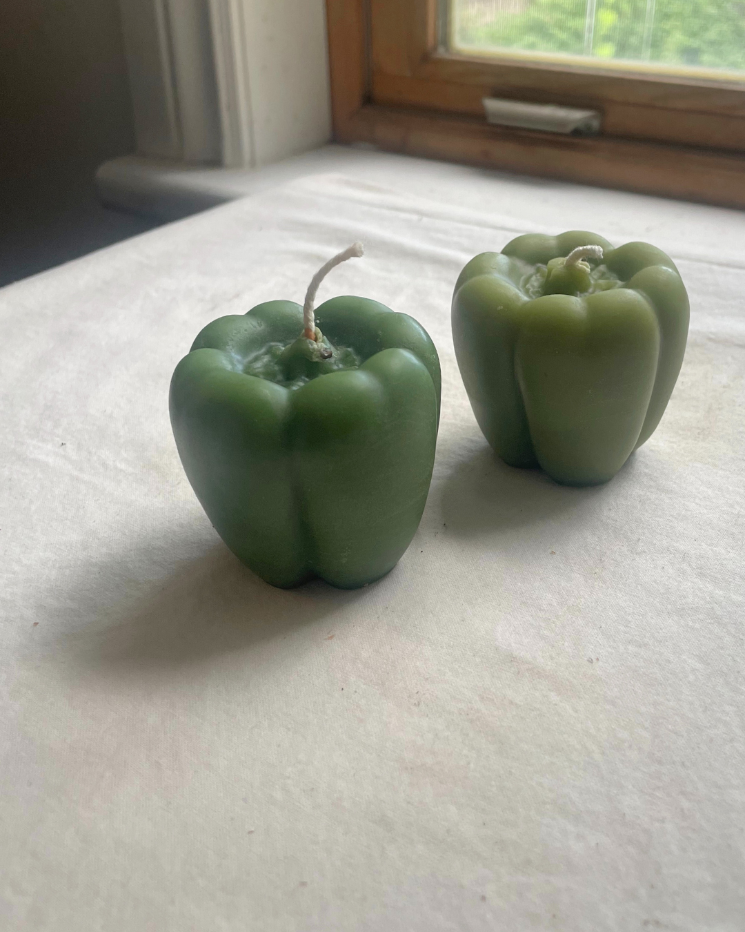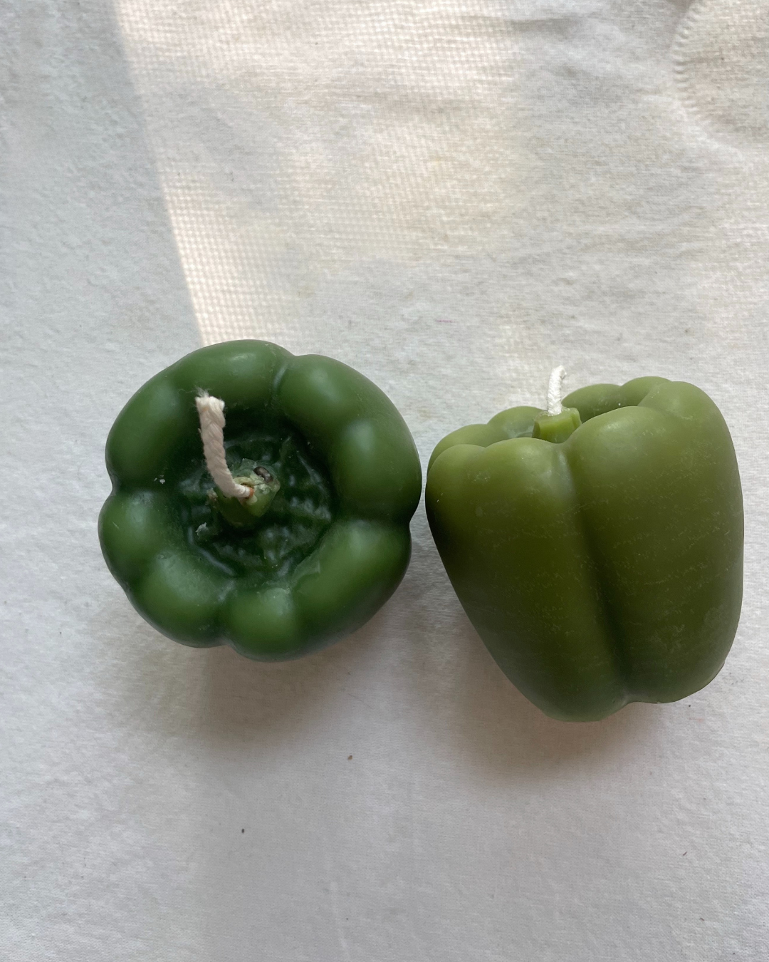 A crisp green pepper, with a twist. This one's in pure beeswax, and looks just like the real thing. Made one at a time, with hand-filtered local beeswax and Prop-65-tested vegetable-based eco dyes. (Also available in red or yellow)