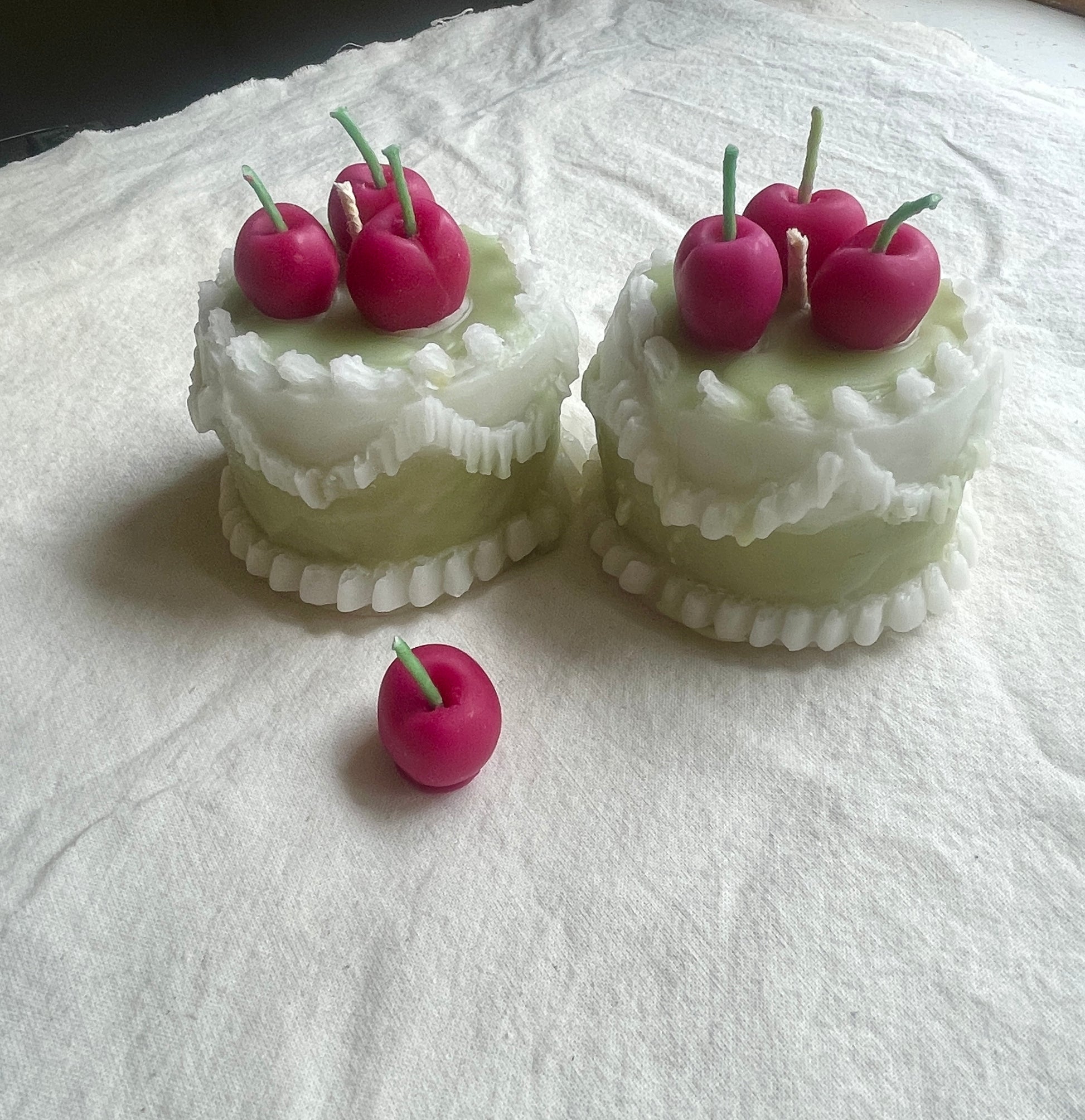 ++++ You will receive one pistachio beeswax cake candle with 3 cherry candles on top. The cherries are loose so you can place them however you would like. They do have wicks and can be lit or left unlit (and will melt as the center wick burns).