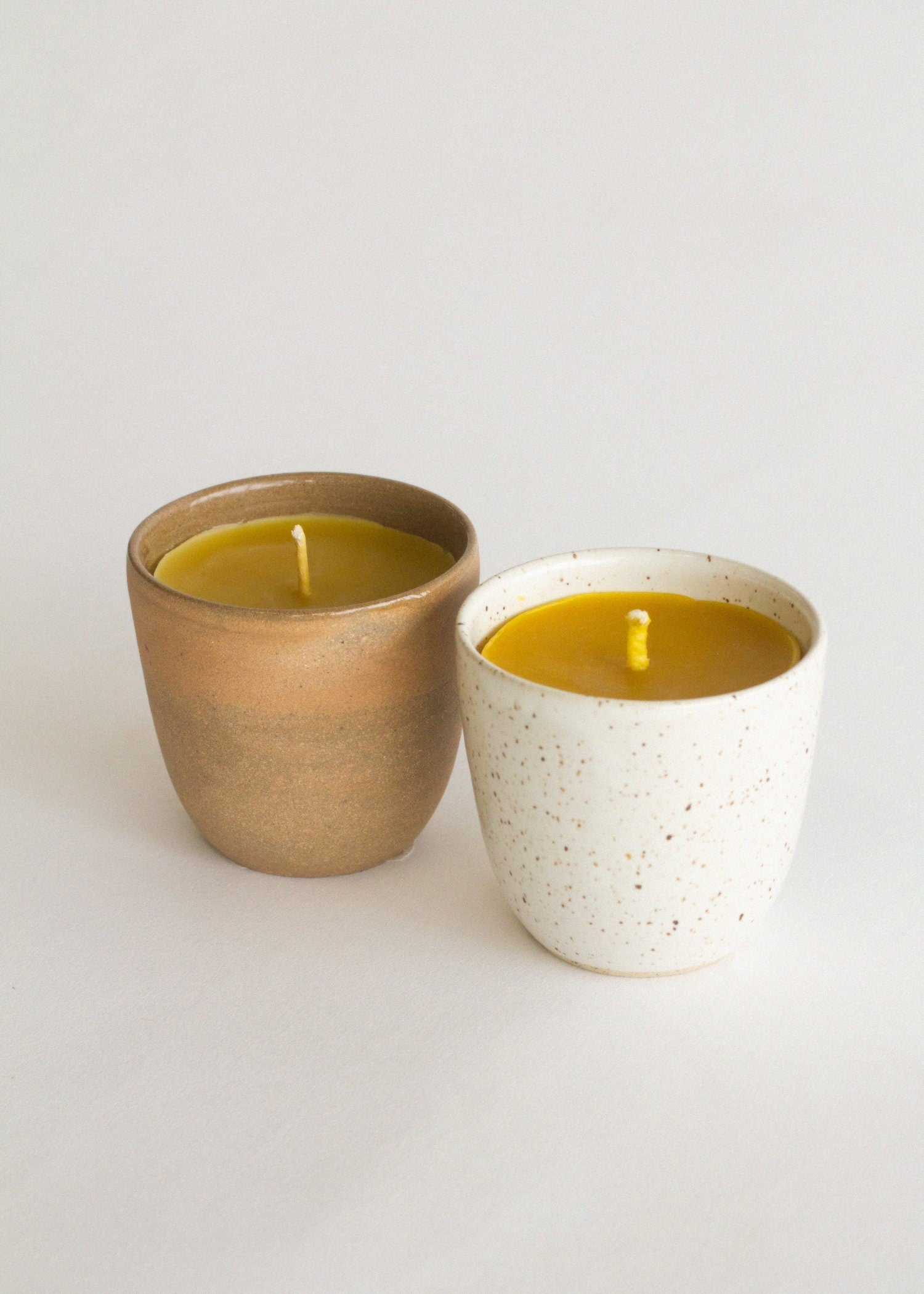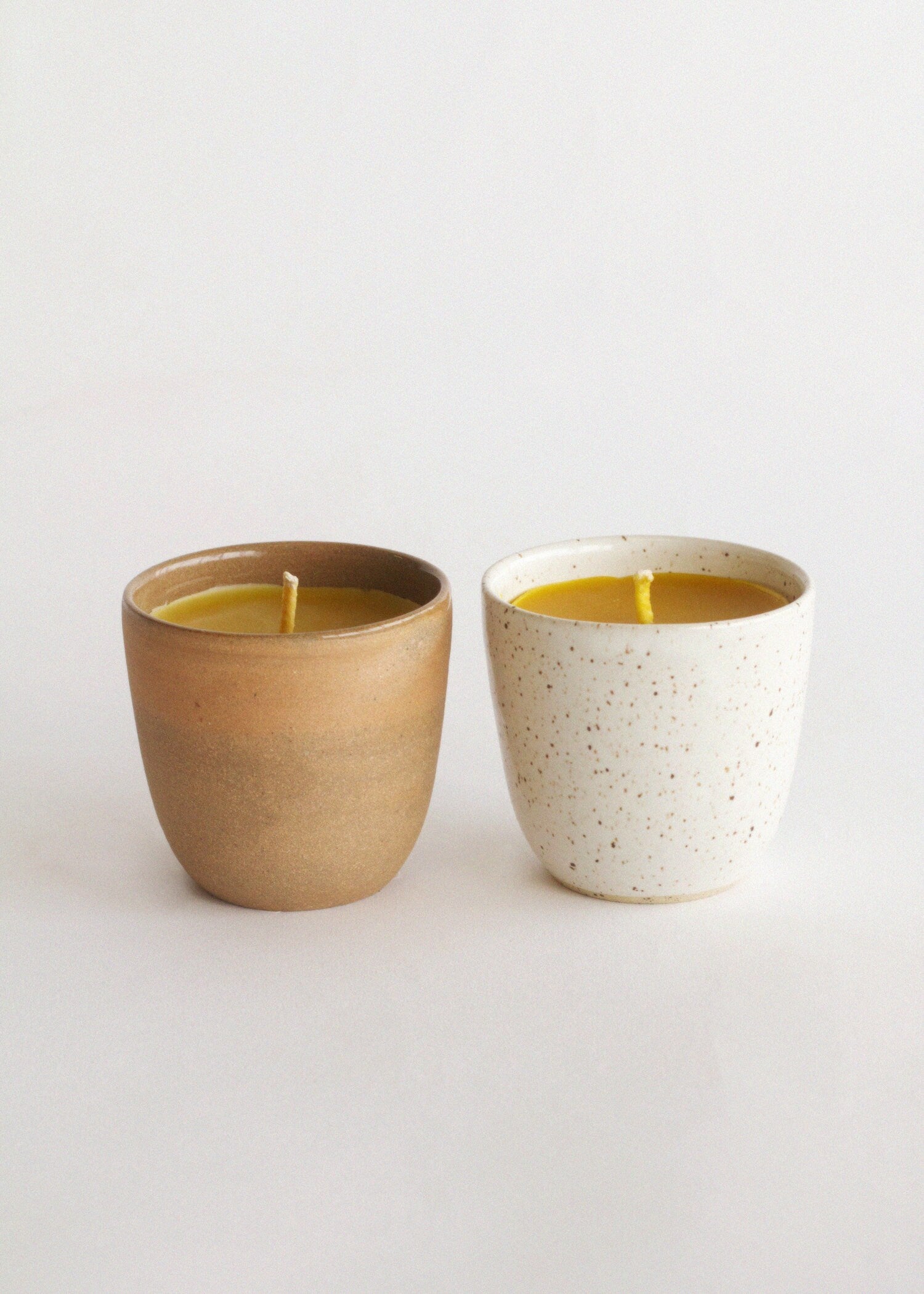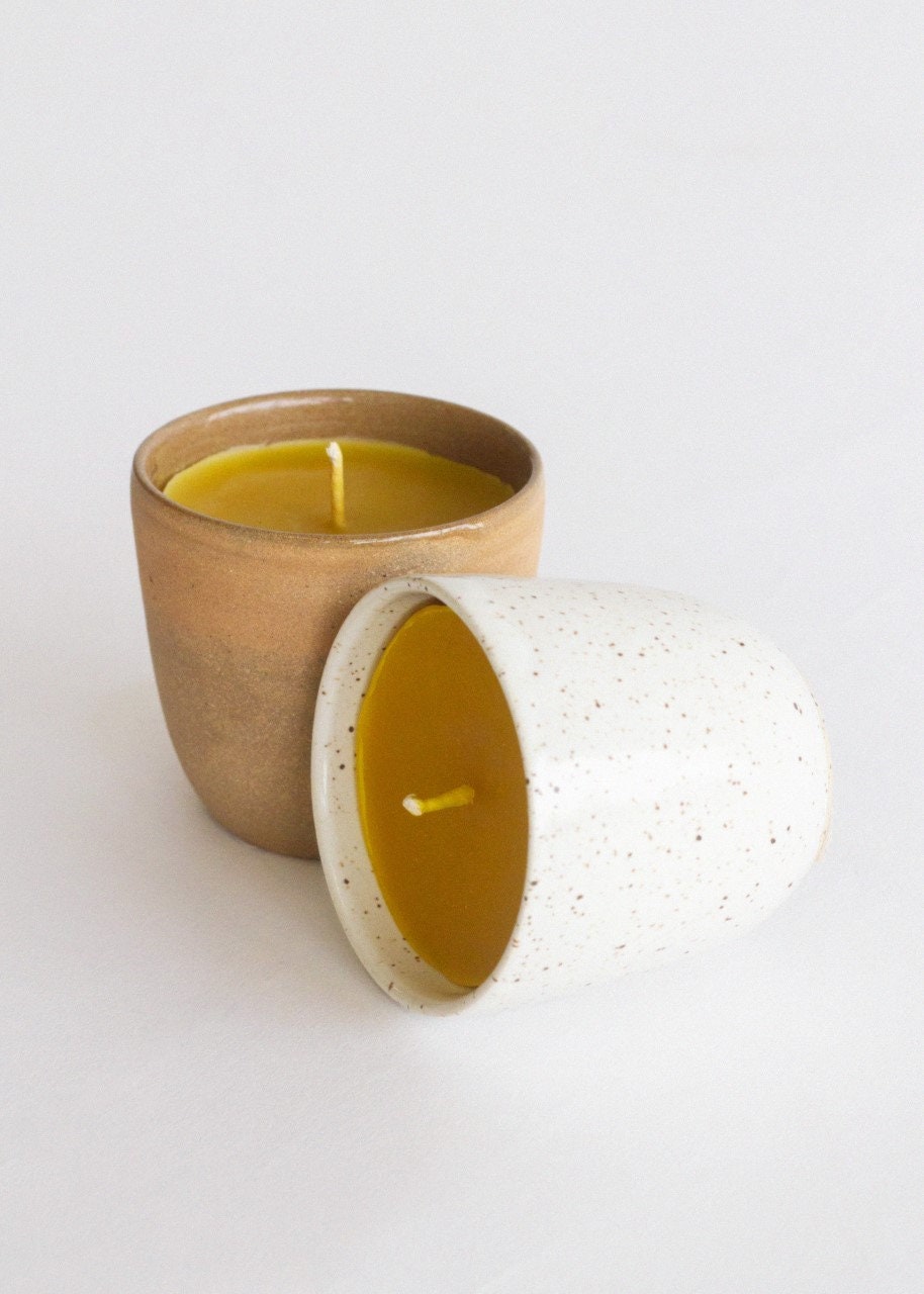 Made in collaboration between myself, as candlemaker, and @ChampagneCeramics, a Montreal-based ceramic artist. This is a little collection we launched, with only a small number of candles available. You will receive a stoneware cup filled with 100% pure and hand filtered beeswax. The white speckled stoneware cup is finished with a satin white glaze. Each cup mesures approximatively 3 inches x 3 inches and contains 5 oz. Made on the wheel, each of them varies slightly. Each single-wicked candle will burn for over 25 hours. 💛